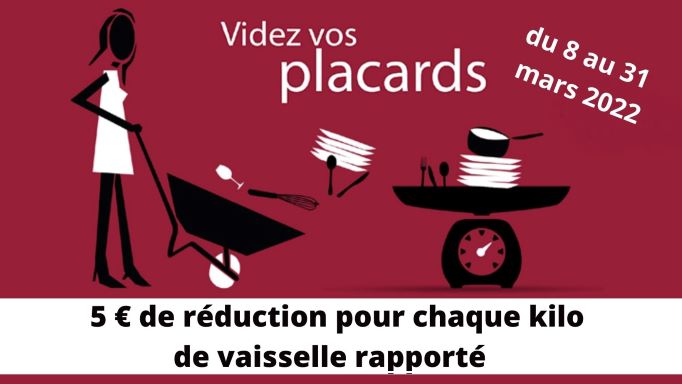![]() Videz vos placards, faites du tri et une bonne action tout en vous faisant plaisir ! Pour chaque kilo de vaisselle, ustensiles de cuisine, nappes et serviettes rapporté du 8 au 31 mars 2022, recevez un bon de réduction de 5 € utilisable jusq'au 31 mars sur l'achat d'articles d'art de la table, vaisselle et linge de table. Vous pouvez rapporter, si possible dans des cartons ou sacs, vos vieilles assiettes, vos vieux verres, vos vieux couverts, vos couteaux de table, couteaux de cuisine, poeles, casseroles, faitouts, nappes, serviettes… tout ce que vous utilisez pour mettre la table et préparez les plats, quelque soit la matière… Les produits doivent être propres et en état d'usage. Pas besoin de les peser, votre magasin le fait pour vous ! La pesée sera faite devant vous et un bon de réduction de 5€ vous sera remis pour chaque kilo rapporté. Les bons de réduction de 5€ peuvent être utilisés du 8 mars au 31 mars 2022, dans votre boutique Rhomeo Decoration, sur l'achat d'articles d'art de la table, vaisselle et linge de table. Ils sont cumulables entre eux. Exemple : - 1 bon de réduction de 5 € donne droit à une réduction de 20% sur un achat de 25 € Les bons de réduction ne peuvent pas être cumulés avec des promotions en cours ou tout autre type de remise. Les produits rapportés seront donnés aux associations caritatives locales (Emmaüs Le Petit Quevilly, Saint Vincent de Paul Boos, Résistes Darnétal...). |